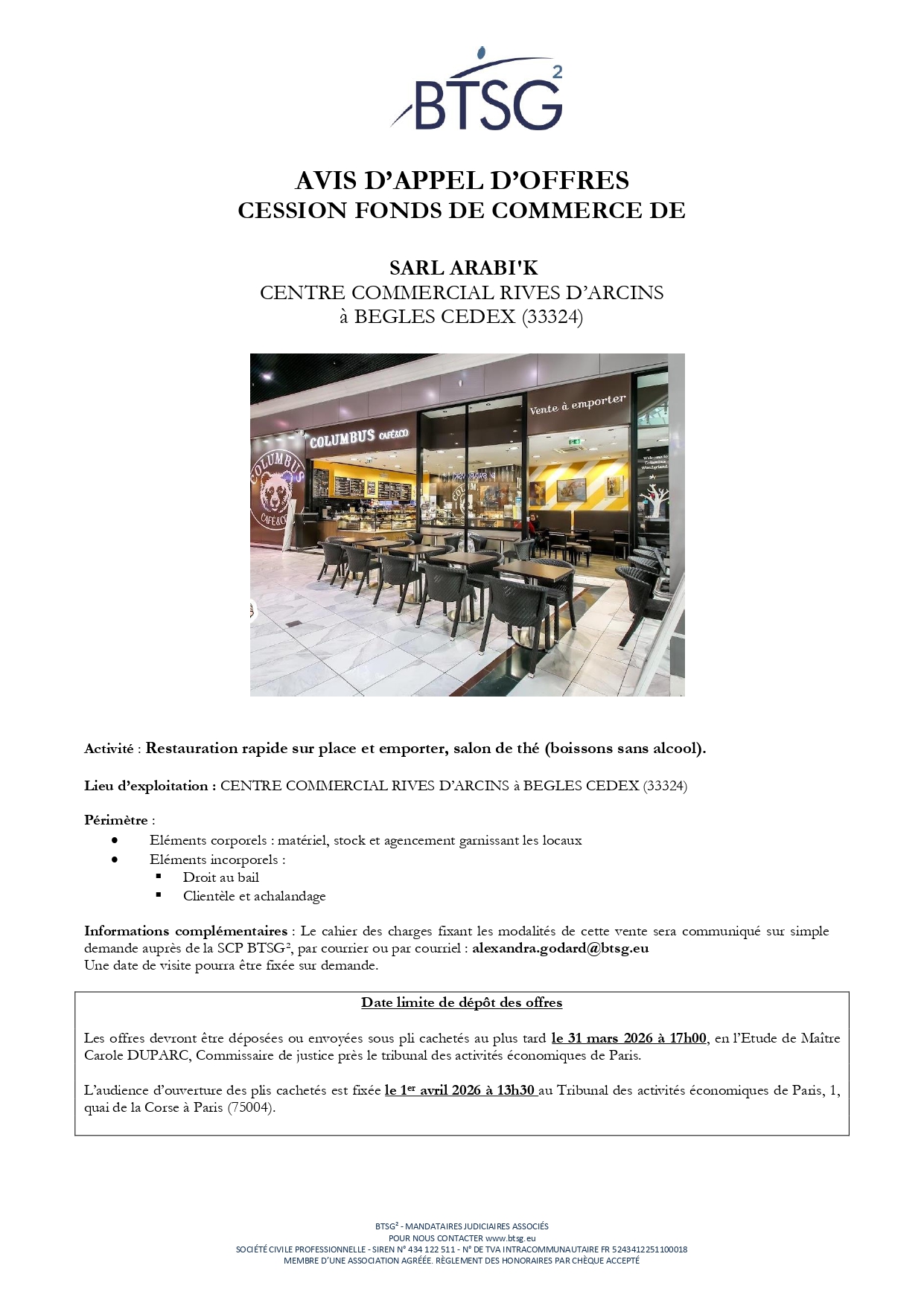Périmètre : - Droit au bail portant sur des locaux situés dans le centre commercial LES RIVES D'ARCINS à Bègles (33324), - Clientèle et achalandage, - Eléments corporels inventoriés par le Commissaire de Justice et appartenant en propre à la SARL ARABI'K.