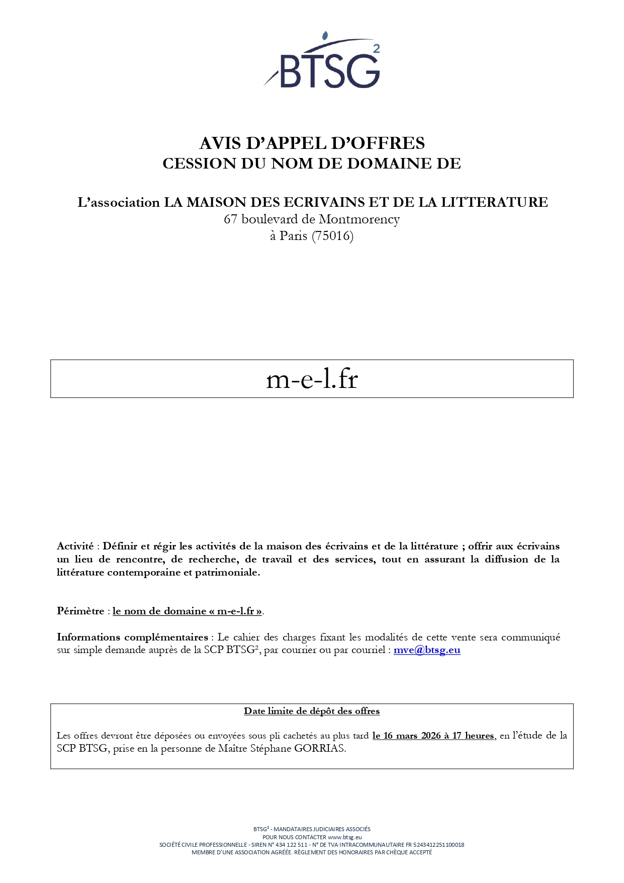 Description | Nom de domaine « m-e-l.fr » dépendant de la liquidation judiciaire de l'association LA MAISON DES ECRIVAINS ET DE LA LITTERATURE |
