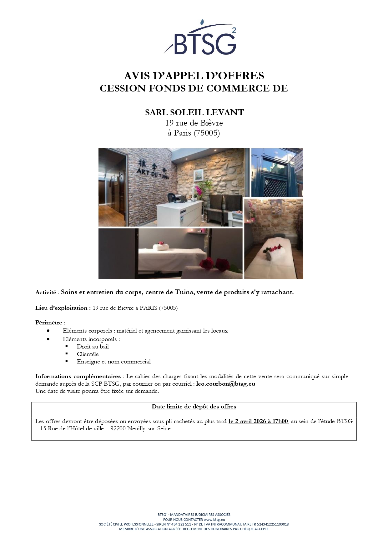 A vendre : SALON DE MASSAGE SOLEIL LEVANT 75005 PARIS